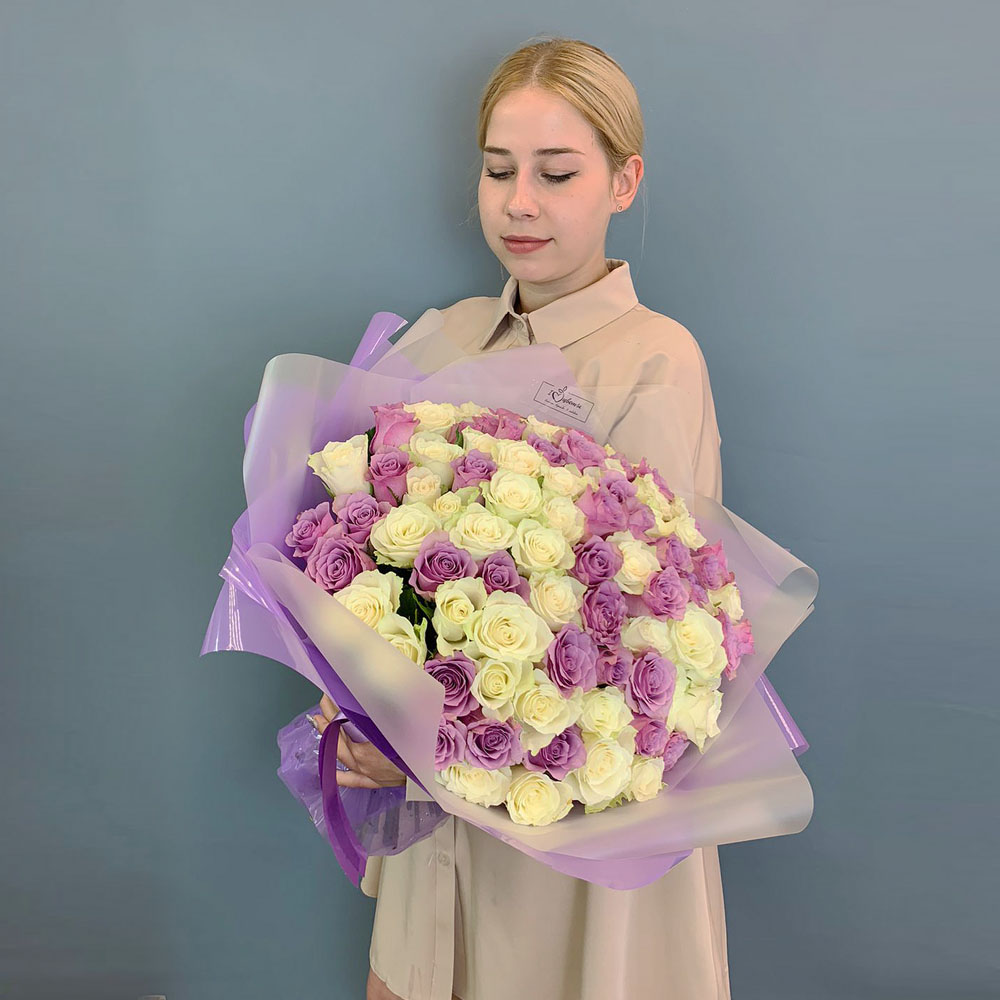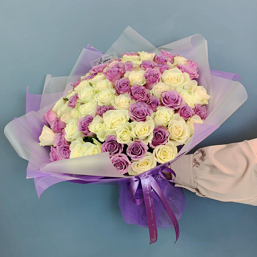 Букет 101 бело-сиреневая роза Кения в упаковке арт. 29178-Р