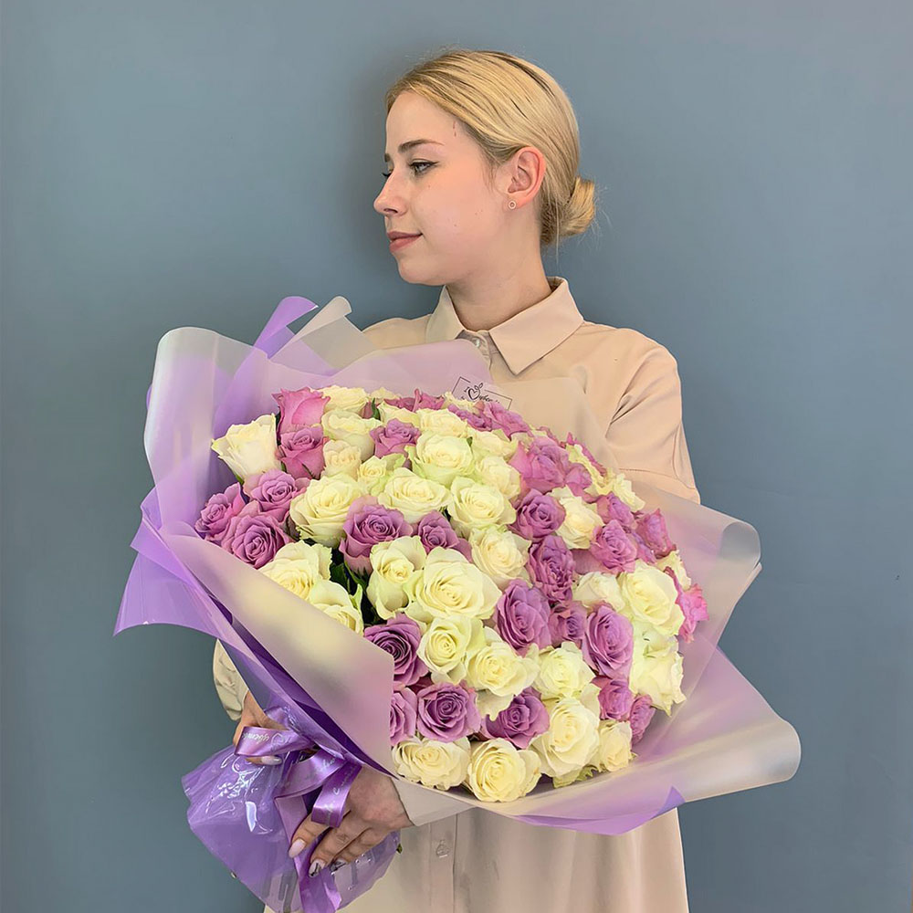 Такой большой букет дарят маме, любимой, девушке или в благодарность, когда хочется произвести впечатление деликатно, но заметно. Контраст нежных оттенков делает композицию атмосферной и запоминающейся, а моноформат остаётся классикой, которая всегда читается благородно. Этот бело-сиреневый микс подойдёт и для тёплого праздника, и для момента, который хочется превратить в красивый жест.